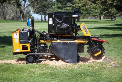 A stump grinder chews away at the stump wood that’s left after a tree has been cut down. All stump grinders use a powerful, rotating blade that rips into the wood as it turns. The blade’s teeth cut the stump wood into small pieces. The operator guides the blade over the entire stump as the blade reduces the wood to chips, and takes the stump down to well below ground level.